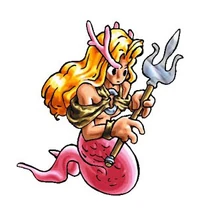 The Mermaid has the appearance of a blonde woman, with the upper body of a female and the lower body of a pink fish. She wields a trident in both hands. A class that excels in the water, the Mermaid can act either as a decent front row attacker or cast a magical blizzard on its enemies from the back row. At Level 11, with a Cha. of 50+, and an Ali. of 50+ the Mermaid can be promoted into a Nixie.