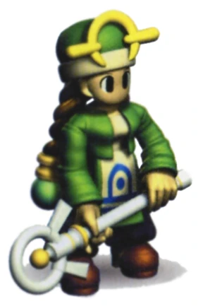 High ranking Cleric who's compassionate prayer heals the injured. Similar to Clerics, Priests wear two blond braids on the back of their heads that trail down to their ankles. Each braid is capped with a green ornament. On their heads, they wear green caps with yellow ornaments which appear to be in the shape of upside-down arcs. They wear green robes and wield white or yellow maces. Enemy Priests wear peach caps and garments. Aisha wears pink robes, sports the same braids, but does not wear a cap.